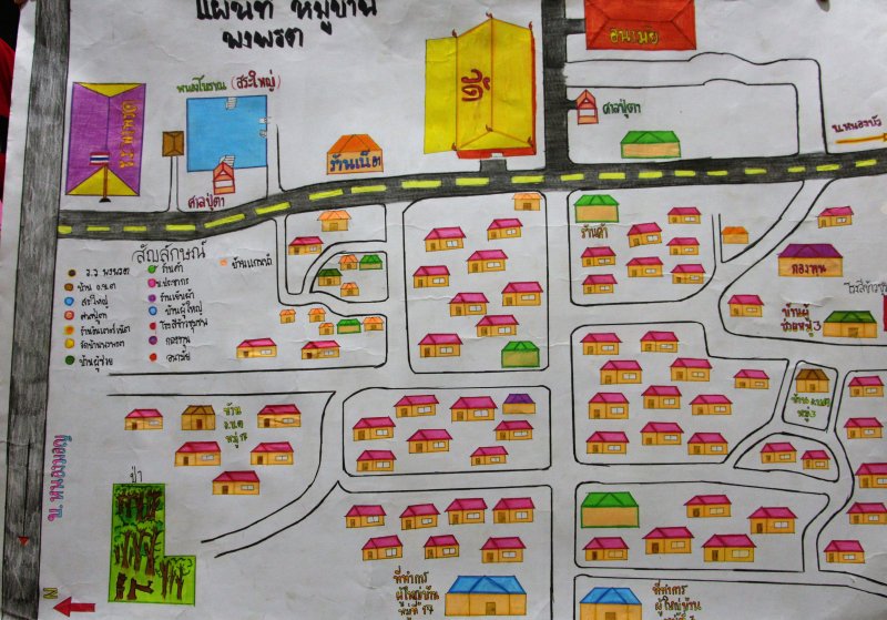 “Time line จะบอกเหตุการณ์แต่ละช่วงว่ามันเกิดอะไรขึ้นในชุมชนบ้าง ปฏิทินวัฒนธรรมจะบอกว่า ใน 1 ปีเราทำกิจกรรมประเพณีอะไรบ้าง ปฏิทินการผลิตก็จะบอกว่า ใน 1 ปีในชุมชนของเราทำอาชีพอะไรกันบ้าง ส่วนแผนที่เดินดินทำให้บอกจุดบอกตำแหน่ง บอกบริบทชุมชนมีอะไรบ้างในชุมชน มีทรัพยากรอะไร บอกเส้นทางด้วย เพราะผมเองเกิดในหมู่บ้านแท้ๆ ก็ยังไม่รู้เส้นทาง เพราะซอกซอยมันเยอะมาก” จักรเล่าถึงจุดเด่นของเครื่องมือแต่ละตัว