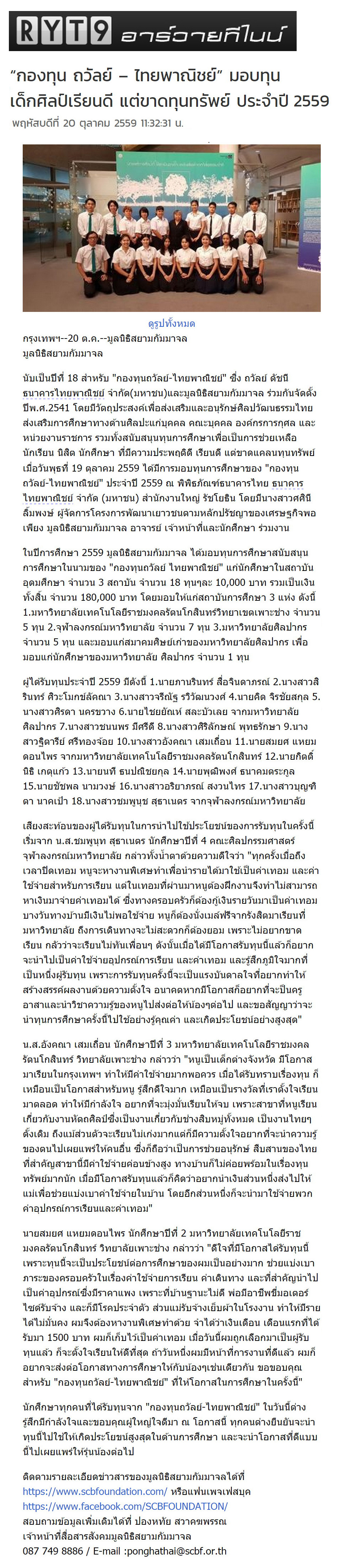 อ่านข่าวออนไลน์ได้ที่ : “กองทุน ถวัลย์ – ไทยพาณิชย์” มอบทุนเด็กศิลป์เรียนดี แต่ขาดทุนทรัพย์ ประจำปี 2559