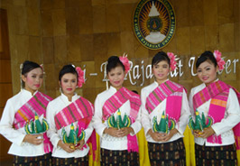 “มาลาดวงดอกไม้ มาลาดวงดอกไม้ มาตั้งไว้เพื่อบูชา บูชาแด่พระพุทธ บูชาแด่พระพุทธ ผู้ได้ตรัสรู้มา บูชาแด่พระธรรม บูชาแด่พระธรรม ผู้แนะนำพร่ำสั่งสอน บูชาแด่พระสงฆ์ บูชาแด่พระสงฆ์ ผู้ดำรงพระวินัย...” |