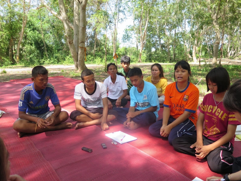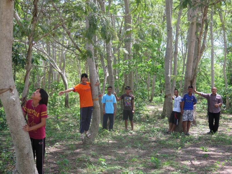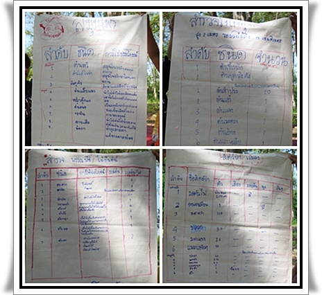 “โดยตอนแรกพวกเราเริ่มต้นจากการลงพื้นที่สำรวจป่ากับ ลุงดัน ทวีชาติ ปราชญ์ชุมชน เพื่อเก็บข้อมูลสำรวจต้นไม้และพันธุ์ไม้หายาก ซึ่งต้นไม้ที่พบมากก็คือ ต้นจิก และต้นมะกอกป่า ทั้งสองชนิดนี้เป็นต้นไม้ประจำท้องถิ่นและพบมากในชุมชน ส่วนต้นพยุง และต้นประดู่ จะพบน้อยลง ซึ่งเมื่อก่อนพืชทั้งสองชนิดนี้มีอยู่เยอะพอๆกับสองชนิดแรก แต่ที่เหลือน้อยลงเพราะมีคนลักลอบตัดไปขายเนื่องจากเป็นไม้เศรษฐกิจที่มีราคาค่อนข้างแพง ...แต่การลงพื้นที่สำรวจป่านั้นพวกหนูไม่สามารถทำได้ทั้งหมด เพราะป่ามีพื้นที่กว้าง 200 ไร่ พี่ประมวล ดวงนิล เจ้าหน้าที่โครงการพัฒนาเยาวชนพลเมืองดีศรีสะเกษ จึงแนะนำให้ลองตีแปลงเพื่อสำรวจชนิดและขนาดของพันธุ์ไม้และเปรียบเทียบความอุดมสมบูรณ์ของป่า โดยแบ่งพื้นที่การตีแปลงเป็น 2 ส่วน คือ ส่วนที่สมบูรณ์และเสื่อมโทรมแต่ละแปลงมีขนาด 10 x 10 เมตร นอกจากนี้แต่ละแปลงยังได้ศึกษาเรื่องความหลากหลายของป่าโดยสำรวจเรื่อง *ลูกไม้ , **ไม้หนุ่ม , พรรณไม้ , สมุนไพร และสัตว์ป่า เพราะทั้ง 4-5 เรื่องนี้ถือว่าเป็นองค์ประกอบสำคัญของป่า”นก เล่า