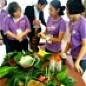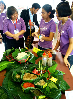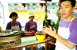 คุณศศินี ลิ้มพงษ์ ผู้จัดการโครงการพัฒนาเยาวชนตามแนวพระราชดำริเศรษฐกิจพอเพียง ชมนิทรรศการอาหารพื้นบ้านของโรงเรียนห้วยยอด จ.ตรัง