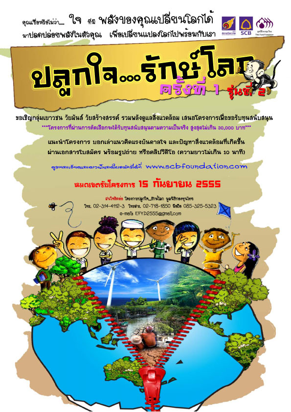 มูลนิธิกองทุนไทย ร่วมกับภาคีองค์กรสิ่งแวดล้อม จัดโครงการ “ปลูกใจ..รักษ์โลก” ครั้งที่ 1 ขึ้น โดยได้รับการสนับสนุนจากมูลนิธิสยามกัมมาจล ธนาคารไทยพาณิชย์ จำกัด (มหาชน) เพื่อสร้างจิตสำนึกให้เยาวชนคนรุ่นใหม่มีสำนึกรักษ์สิ่งแวดล้อม และพัฒนาให้เติบโตเป็นพลเมืองที่มีคุณภาพในอนาคต โดยเปิดรับสมัครข้อเสนอโครงการของกลุ่มเยาวชน อายุระหว่างระหว่าง 15 - 25 ปี แต่ละกลุ่มมีแกนนำไม่น้อยกว่า 3 คน มีระยะเวลาในการดำเนินงานไม่น้อยกว่า 6 เดือน และไม่เกิน 7 เดือน และอยู่ในพื้นที่ที่มีปัญหาสิ่งแวดล้อมใน 5 ประเด็น ได้แก่ (1) ปัญหาการเปลี่ยนแปลงสภาวะภูมิอากาศ (สภาวะโลกร้อน)และมลภาวะทางอากาศ (2) ปัญหาการเสื่อมโทรมของทรัพยากรป่าไม้ (3) ปัญหาการเสื่อมโทรมของทรัพยากรทางทะเลและชายฝั่ง (4) ปัญหาการเสื่อมโทรมของแหล่งน้ำ (5) ปัญหาการเสื่อมโทรมของดินซึ่งกิจกรรมต่างๆ จะต้องเป็นการรวมกลุ่มของเยาวชนเพื่อทำกิจกรรมฟื้นฟูและดูแลสิ่งแวดล้อมอย่างสร้างสรรค์และชัดเจน สามารถทำกิจกรรมต่อไปได้ในอนาคต