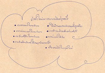 “ปัญหาจากตนเอง :- อารมณ์ร้อน ปากไวปากจัด มีปัญหาอะไรไม่ค่อยพูด เก็บปัญหาไว้กับตนเอง ชอบทำงานคนเดียว / ปัญหาจากผู้อื่น :- เวลาการทำงานไม่ตรงกัน การทำงานไม่เข้าใจกันในกลุ่ม ผู้คนไม่ค่อยให้ความร่วมมือในการทำงานหรือช่วยเหลือ การขาดอุปกรณ์ที่ใช้ในการทำงานต่างๆ ระยะเวลาในการทำไม่เพียงพอ"