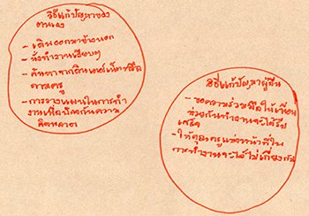 “วิธีแก้ปัญหาจากตนเอง :- เดินออกมาข้างนอก นั่งทำงานเงียบๆ ค้นหาจากอินเทอร์เน็ตหรือถามครู การวางแผนในการทำงานเพื่อป้องกันความผิดพลาด / วิธีแก้ปัญหาจากผู้อื่น :- ขอความร่วมมือให้เพื่อนช่วยกันทำงานจะได้รีบเสร็จ ให้คุณครูแบ่งหน้าที่ในการทำงานจะได้ไม่เกี่ยงกัน"