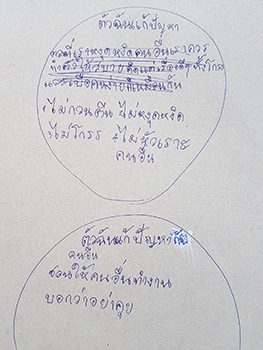 "วิธีแก้ปัญหาจากตัวเรา :- ไม่กวนคนอื่น ไม่หงุดหงิด ไม่โกรธ ไม่หัวเราะคนอื่น / วิธีแก้ปัญหาจากคนอื่น :- ชวนให้คนอื่นทำงาน บอกว่าอย่าคุย"