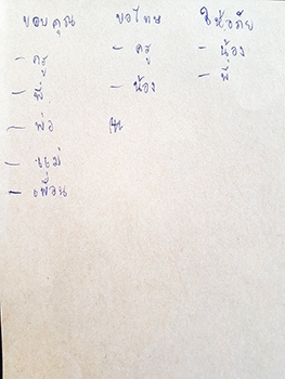 "ขอบคุณ :- ครู พี่ พ่อ แม่ เพื่อน / ขอโทษ :- ครูและน้อง / ให้อภัย :- น้องและพี่"