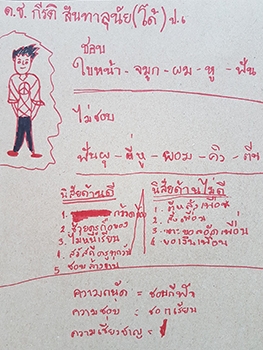 "สำรวจรูปร่าง-หน้าตา :- ชอบใบหน้า จมูก ผม หูและฟัน, ไม่ชอบฟันผุ ติ่งหู ผอม คิ้วและเท้า / นิสัยด้านบวก :- กวาดห้อง ช่วยครูถือของ ไม่หนีเรียน สวัสดีครูทุกวัน ล้างจาน / นิสัยด้านลบ :- ตีหลังเพื่อน สั่งเพื่อน เตะบอลอัดเพื่อน ขอเงินเพื่อน / ความถนัด-ความชอบ :- ชอบกีฬาและชอบเรียน"