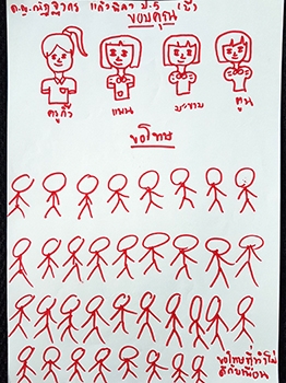 "ขอบคุณ :- ครูกิ๊ว แพน มะขาม ตูน / ขอโทษ :- ที่ทำไม่ดีกับเพื่อน"