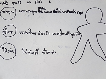 "ขอบคุณ :- ทุกคนที่ช่วยกันทำงาน / ขอโทษ :- น้องจักเพราะโดนตีทุกวัน / ให้อภัย :- เป้ที่โดนด่า