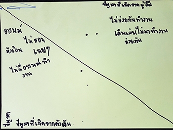 "ปัญหาจากตัวเอง :- ไม่อยากทำงาน หัวร้อน อารมณ์ร้อน ไม่ชอบ / ปัญหาจากผู้อื่น :- เพื่อนไม่ช่วยกันทำงาน เดินเล่นไม่ช่วยงาน"