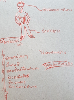 "สำรวจรูปร่าง-หน้าตา :- ชอบผมเพราะตรง ชอบกางเกง, ไม่ชอบรองเท้า / นิสัยด้านบวก :- เป็นคนดี ชอบช่วยเพื่อนทำงาน ช่วยเหลือสัตว์ ช่วยยกของ ช่วยพ่อ-แม่ทำงาน / นิสัยด้านลบ :- ไม่ชอบทำการบ้าน"