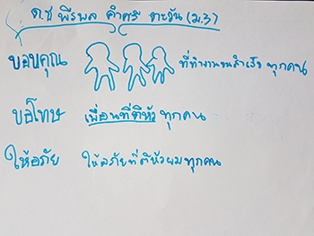 "ขอบคุณ :- ทุกคนที่ทำงานจนสำเร็จ / ขอโทษ :- เพื่อนทุกคนที่ตีหัว / ให้อภัย :- เพื่อนทุกคนที่ตีหัวผม"