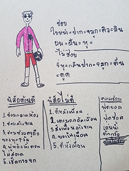 "สำรวจรูปร่าง-หน้าตา :- ชอบปาก จมูก คิ้วและลิ้น, ไม่ชอบขี้หู กลิ่นปาก จมูก เท้าและก้น / นิสัยด้านบวก :- กวาดห้อง ล้างจาน ช่วยครูถือของทุกวัน ล้างห้องน้ำ เช็ดกระจก / นิสัยด้านลบ :- ตีหลังเพื่อน เตะบอลอัดเพื่อน สั่งเพื่อนล้างจาน ขอเงินเพื่อน ตีหัวเพื่อน / ความชอบ :- ฟุตบอล ฟุตซอล เล่นน้ำ ตะกร้อ"