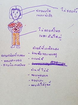 "สำรวจรูปร่าง-หน้าตา :- ชอบแก้มเพราะน่ารัก, ไม่ชอบคิ้ว ไม่ชอบสะโพกเพราะใหญ่ / นิสัยด้านบวก :- ช่วยครูถือของ อารมณ์ดี / นิสัยด้านลบ :- พูดมาก ชอบเที่ยว ชอบทำใส่รุ่นพี่ / ความถนัด-ความชอบ :- ชอบเตะบอล ชอบวิชาภาษาไทย"