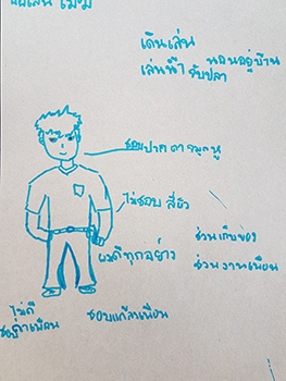 "สำรวจรูปร่าง-หน้าตา :- ชอบปาก ตา จมูกและหู, ไม่ชอบสีผิว / นิสัยด้านบวก :- ช่วยเก็บของ ช่วยงานเพื่อน / นิสัยด้านลบ :- แกล้งเพื่อน ด่าเพื่อน / ความถนัด-ความชอบ :- เล่นน้ำ เดินเล่น จับปลา นอนอยู่บ้าน"