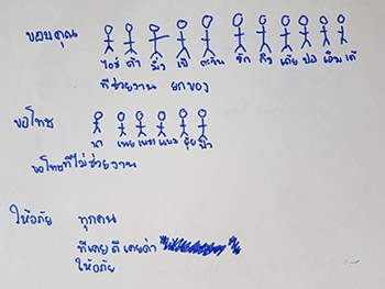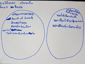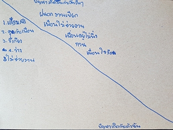 "ปัญหาจากตัวเรา :- เสียสติ คุยกับเพื่อน ขี้เกียจ ว่าง ไม่ช่วยงาน / ปัญหาจากผู้อื่น :- เพื่อนไม่ช่วยงาน เพื่อนอยู่ไม่นิ่ง กวน เพื่อนใจร้อน ฝนตกงานเปียก"