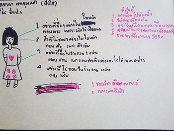 "สำรวจรูปร่าง-หน้าตา :- ชอบผมเพราะเก็บไว้ถักเปีย ชอบแขนเพราะช่วยทำอะไรได้หลายอย่าง, ไม่ชอบคิ้วเพราะคิ้วเข้ม ไม่ชอบเล็บ / นิสัยด้านบวก :- พาเพื่อนไปห้องน้ำ ให้ขนมเพื่อน ทำให้เพื่อนหัวเราะ อยู่เป็นเพื่อนตอนเพื่อนเหงา"