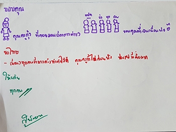 "ขอบคุณ :- คุณครูกุ้ง ที่คอยสอนเรื่องต่างๆ และเพื่อน / ขอโทษ :- เพื่อนๆ ทุกคนที่บางครั้งทำตัวไม่ดี คุณครูที่ไม่ค่อยฟัง พ่อ-แม่ที่ดื้อมาก / ให้อภัย :- ทุกคน"