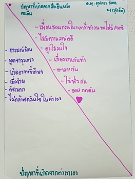 "ปัญหาจากตัวเรา :- อารมณ์ร้อน พูดจากรุนแรง เกิดอาการขี้เกียจ เบื่อง่าย คิดมาก ไม่กล้าตัดสินใจในตัวเอง / ปัญหาจากผู้อื่น :- เพื่อนชอบกวนในเวลาที่ทำงานจนไม่มีสมาธิ ไม่มีความสามัคคี ครูไม่สนใจ เกี่ยงงานกันทำ ทะเลาะกัน ไม่ฟังกัน ชอบกดดัน"