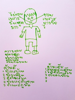 "สำรวจรูปร่าง-หน้าตา :- ชอบจมูกเพราะใช้หายใจ ไม่ชอบปากเพราะพูดมาก / นิสัยด้านบวก :- ทำการบ้าน ช่วยเพื่อน ตั้งใจเรียน ช่วยแม่ทำงานบ้านถูบ้าน ล้างจาน / นิสัยด้านลบ :- ชอบแกล้งเพื่อน ไม่ตั้งใจเรียน ชอบว่าเพื่อน"