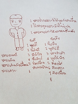 "สำรวจรูปร่าง-หน้าตา :- ชอบปากเพราะว่าได้พูดกับคนอื่น ชอบตาเพราะได้มองเห็นคนอื่น, ไม่ชอบก้นเพราะมันใหญ่ / นิสัยด้านบวก :- พูดดี นิสัยดี มีน้ำใจ ซื่อสัตย์ ช่วยเพื่อนทำการบ้าน / นิสัยด้านลบ :- ขี้เกียจ พูดไม่ดี ชอบว่าคนอื่น พูดไม่ฟัง ติดเฟส ติดเที่ยว ติดเพื่อน / ความถนัด-ความชอบ :- ชอบดนตรี ชอบเต้น ชอบเล่นกับเพื่อน ชอบเที่ยว"