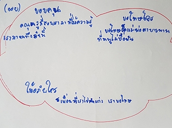 "ขอบคุณ :- คุณครูที่สอนและให้ความรู้ / ขอโทษ :- พ่อ-แม่ ตา-ยาย ที่ไม่เชื่อฟัง และขอโทษเพื่อนที่เราไปแกล้ง"