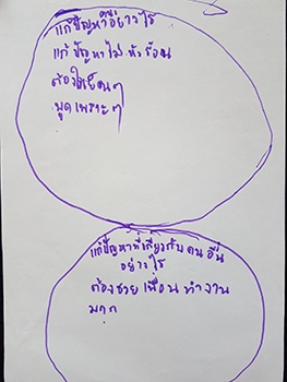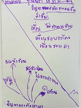 "ปัญหาจากตัวเรา :- หัวร้อน พูดจาไม่ดี ไม่ชอบทำงาน ใจร้อน / ปัญหาจากผู้อื่น :- ครูหัวร้อน เพื่อนไม่ทำงาน เพื่อนชอบแกล้ง เพื่อนชอบว่า"