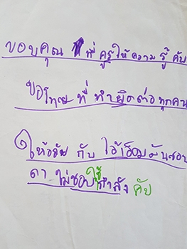 "ขอบคุณ :- ครูที่ให้ความรู้ / ขอโทษ :- ที่ทำผิดต่อทุกคน / ให้อภัย :- เอ็มที่ชอบว่า"