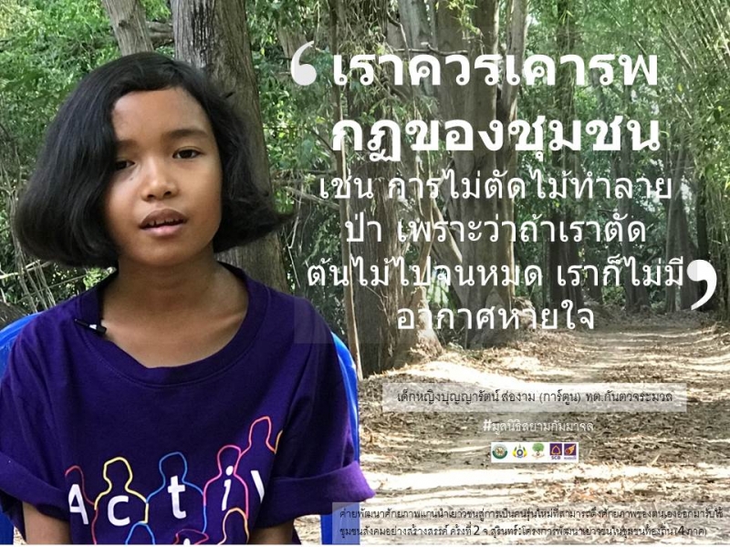 การเรียนรู้นอกห้องเรียนสำคัญอย่างไร สำหรับเด็กหญิงตัวเล็กๆ เช่น น้องการ์ตูน หรือ เด็กหญิงบุญญารัตน์ ส่องาม วัย 11 ปี ขณะนี้เรียนอยู่ในระดับชั้นประถมศึกษาปีที่ 5 โรงเรียนบ้านทำนบ ตั้งอยู่ที่ หมู่ที่ 4 ตำบลกันตวจระมวล อำเภอปราสาท จังหวัดสุรินทร์ (เป็นน้องสาวของเด็กหญิงกัลยา ส่องามที่มาเข้าค่ายนี้เพร้อมกัน) การต้องอยู่ในค่ายเป็นเวลา 10 วัน “น้องการ์ตูน” ได้ตอบคำถามสิ่งที่ได้เรียนรู้อะไรจากค่ายครั้งนี้ได้อย่างน่าสนใจ เรามาทำความรู้จักกับกระบวนการคิดของเด็กหญิงคนนี้กัน